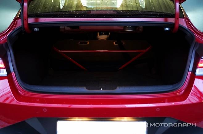 아반떼 N은 트렁크 내 위치한 리어 스티브 바가 단점이다. 강성을 확보하기 위해 트렁크 안쪽에 별도 보강을 더했지만, 실생활에서 트렁크 활용도를 떨어뜨리는 요인이다. 물론 2열 폴딩 기능을 지원하고, 볼트 4개를 풀면 뗄 수 있다. 하지만, 만약 이를 떼고 다니다 재장착 시 차체 틀어짐으로 인해 그 과정이 상당히 고달플 수 있겠다는 우려가 탈거를 망설이게 만든다.