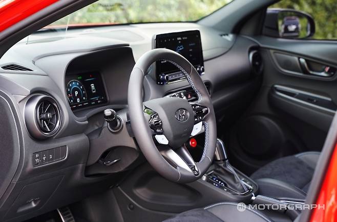 다만 두 차의 실내는 차급에 따른 차이는 물론, 세월의 차이도 가늠할 수 있다. 비교적 최근 풀체인지된 아반떼 N에 비해 코나 N의 실내는 투박하고, 한 세대 전 느낌이 강하다. 아반떼 N은 한층 낮게 깔린 대시보드 형상과 그 아래 적용된 퍼포먼스 블루 컬러 앰비언트 라이트, 센터 스택을 가로지르는 굵직한 바 등이 전혀 다른 분위기를 연출한다.