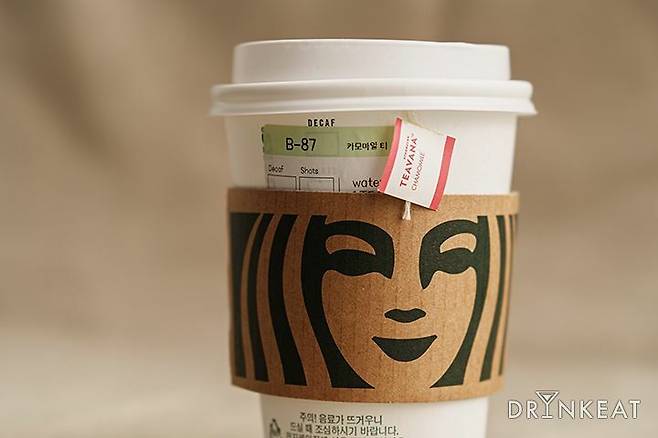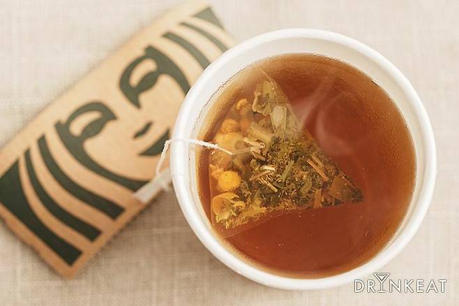 그런 의미에서 투썸플레이스의 TWG는 (보기에 조금 불편할 정도로..) 잘게 다져진 모습이었어요. 이 내용물이 뜨거운 물에 그대로 우러나다니, 얼마나 진한 캐모마일이 완성될까 기대됐어요. 스타벅스의 캐모마일은 다른 티백들과 다르게 레몬그라스, 레몬밤, 히비스커스 등 여러 가지 재료가 블렌딩되어 있다는 점이 특징입니다. 과연 맛에서도 차이가 있었을까요?