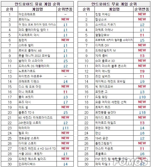 안드로이드 무료 게임 순위에서는 '킹덤 어쌔신'과 '합성소녀'가 각각 1위와 2위를 차지했다.