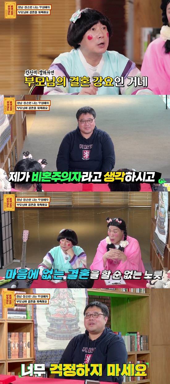 이수근은 "결혼 생각이 없는데 부모님의 결혼 강요를 해서 고민인 거냐"라고 물었고, 의뢰인은 그렇다고 답했다. 이수근은 "부모님 입장에서는 걱정이 된다"라며 "아들이 여자에 대해 관심이 없고 그러면 집에 장손인데 걱정하실 수 있다. 네 입장을 말씀드려 본 적 있냐"라고 물었다.