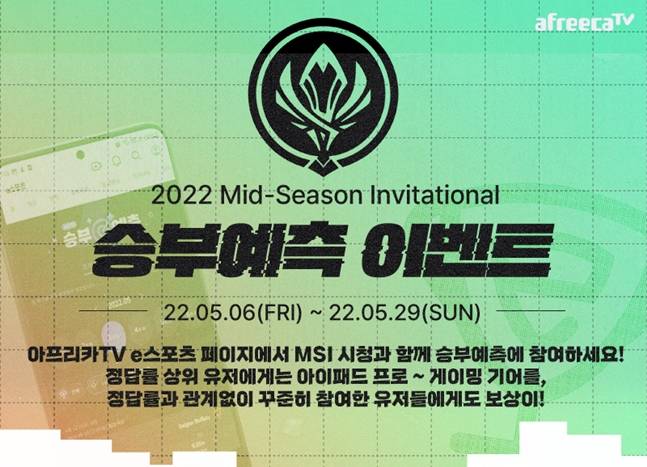 승부예측 이벤트는 아프리카티비 e스포츠 페이지 내 승부예측 메뉴에서 진행되며, 2022 MSI의 개막전부터 결승전까지 진행되는 경기의 승부예측에 참여하는 것으로 이벤트에 참여할 수 있다. 참여 기간 내 가장 많은 예측 성공 횟수를 기록한 유저 1인에게는 백만 원 상당의 아이패드 프로가, 상위 2위에서 5위를 기록한 유저들에게는 게이밍 기어가 경품으로 지급된다.