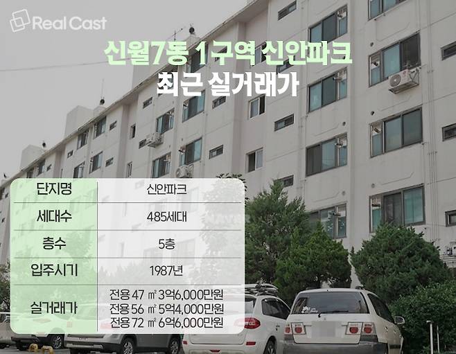 1987년 입주한 신안파크는 전용면적 56㎡가 지난해 11월 5억4,000만원에 거래됐고, 72㎡는 지난해 10월 6억6,000만원에 거래된 바 있습니다. 현재 매물은 전용 60㎡가 6억원선에 나와 있습니다.
