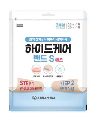 '하이드케어 밴드S'는 두께가 다른 두 장의 밴드로 구성돼 있다. 진물이 많은 초기 상처에는 0.5mm 두꺼운 밴드를, 회복기에 접어든 상처에는 움직임이 편리한 0.3mm의 얇은 밴드로 구성되어 단계 별로 상처를 관리할 수 있다.