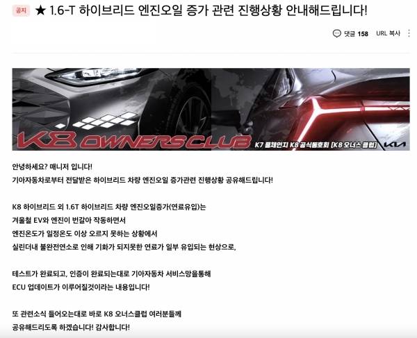 해당 동호회에서 기아와 접촉한 내용은 이렇다. 동호회에 따르면 오일 증가 이유에 대해 "겨울철 냉간시 EV 모드와 엔진 개입이 번갈아 작동할 때 엔진 온도가 일정 수준에 도달하지 못하는 상황에서 실린더 내 불완전 연소가 발생, 기화하지 못한 연료가 유입돼 일부 오일 증가 현상으로 이어졌다"는 설명을 들었다고 한다. 해당 내용은 쏘렌토, 스포티지, K8 등의 동호회를 통해 공지됐다.