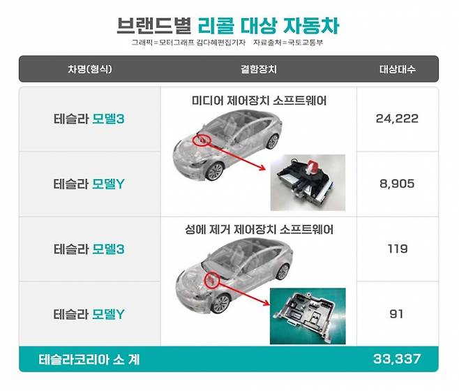 테슬라는 소프트웨어 결함으로 인해 모델3와 모델Y 등 총 3만3337대를 리콜한다. 우선, 모델3(2019년 7월~2022년 1월 생산) 2만4222대와 모델Y(2020년 12월~2021년 10월) 8905대 등 총 3만3127대는 미디어 제어장치 소프트웨어 결함이 드러났다. 해당 차량은 한국교통안전공단 자동차연구원의 조사 결과, 소프트웨어 오류로 운전자가 안전벨트를 착용하지 않고 운행해도 안전벨트 경고음이 울리지 않는 것으로 드러났다.