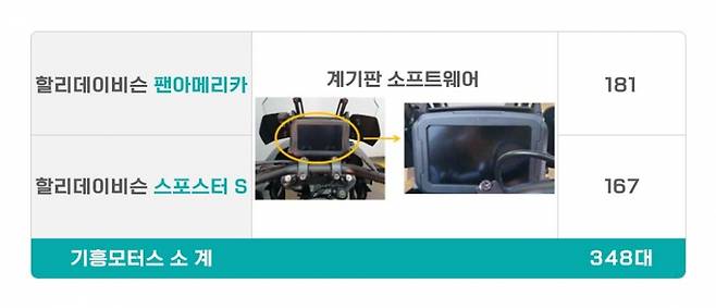 마지막으로 기흥모터스에서 수입ㆍ판매한 할리데이비슨 팬아메리카 등 이륜차 348대(2021년 3월~2021년 8월)는 계기판 결함으로 인해 리콜한다.