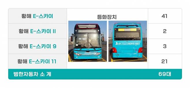 범한자동차에서 수입ㆍ판매한 황해자동차 E-스카이 버스(2020년 6월~2021년 10월) 등 4개 차종 69대는 차량 전ㆍ후면에 자동차 안전기준에서 정하고 있지 않은 등화장치를 설치해 이를 제거하하는 리콜을 한다. 국토부는 추후 시정률을 감안해 과징금을 부과할 예정이라고 밝혔다.