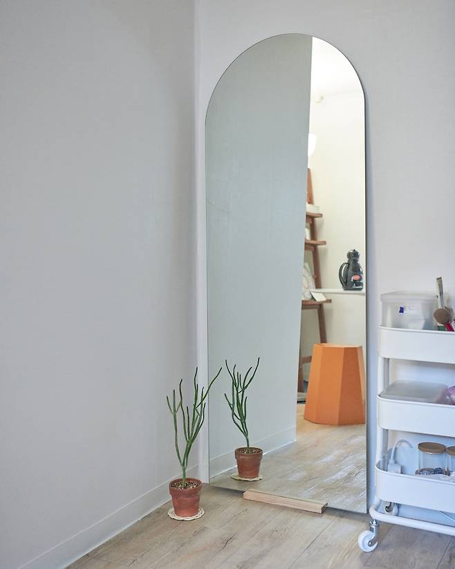 화장대(?) 겸 거울이에요. 평소에 화장을 적극적으로 하는 편이 아니라 이케아 트롤리를 하나 두고 전신거울 앞에서 모든 준비를 마쳐요. 방이 작기 때문에 큰 거울을 선택했고, 작업공간 방향에 놓아 넓어보이도록 했어요. 트롤리는 무인양품의 소형수납을 활용해 깔끔하게 정리했습니다. 거울에 비치는 작업공간과 창가 모습을 너무나 좋아합니다.
