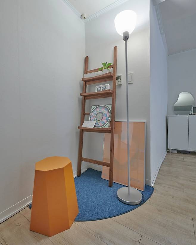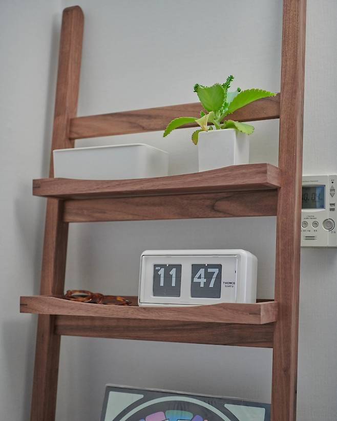 작업 공간은 여전히 어수선한 느낌이 있어야 집중이 잘 되어서 선반 위를 제가 영감받는 것들로 장식했어요. 이 사다리 선반은 가구를 만드는 친구의 도움을 받아 제작하였습니다. 비슷한 가구 제작 원하시면 인스타그램 @denken_seoul 참고해주세요!