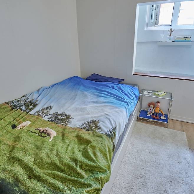 가구도 많지 않고 오브제도 많이 두지 않아 자칫 단조로울 수 있는 이 집의 포인트는 역시 이 벽이에요. 안에 공간이 꽤나 깊어서 고민이 많았어요. 창고로 쓰기에는 아깝고, 들어가서 활동을 하기에는 좁았죠. 지금은 바닥을 깔끔하게 보강하고 페인트칠을 하여 담요를 깔아 놓았습니다. 벽에는 선반을 달아서 공간을 알차게 활용하고 있어요!