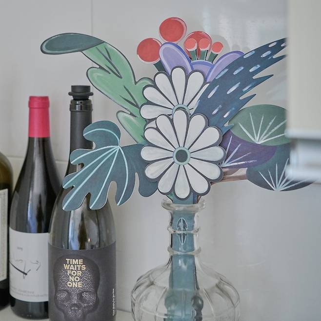 사진에 보이는 꽃다발은 아티스트 '나난' 작가님의 롱롱타임플라워 종이 꽃 엠디상품이에요~ 회사에서 처음뵙게되어 디자인 작업 서브를 오래 하였어요! 좋아하는 작가님의 작픔을 현관입구에 꽂아두었습니다. 함께 보이는 와인들은 디스플레이 용이 아닌 끊임없이 먹어치우는 와인들입니다...🍷