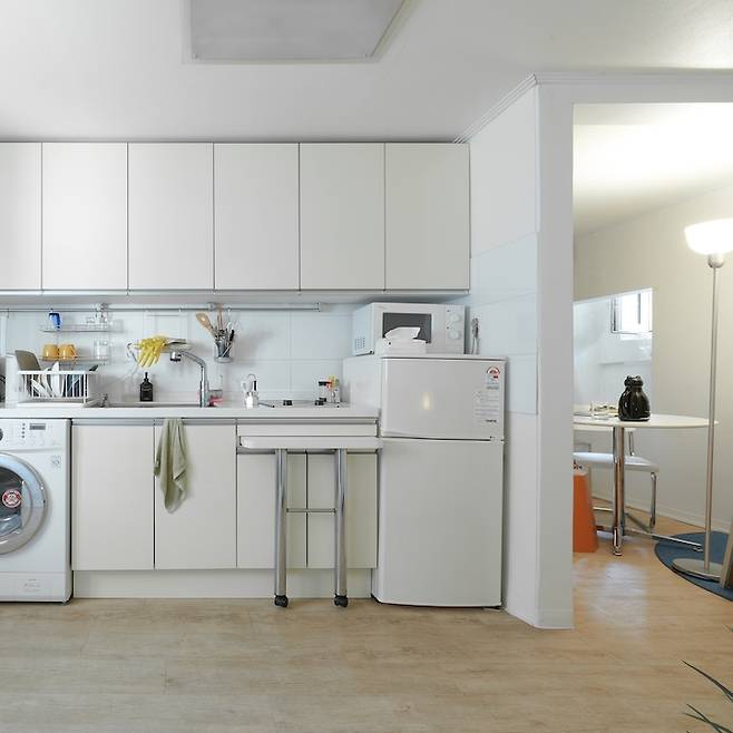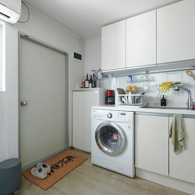 현관문을 열고 들어오면 바로 보이는 복도 겸 부엌의 모습이에요. 부엌이 전체적으로 깔끔하여 특별히 손대지 않았어요.