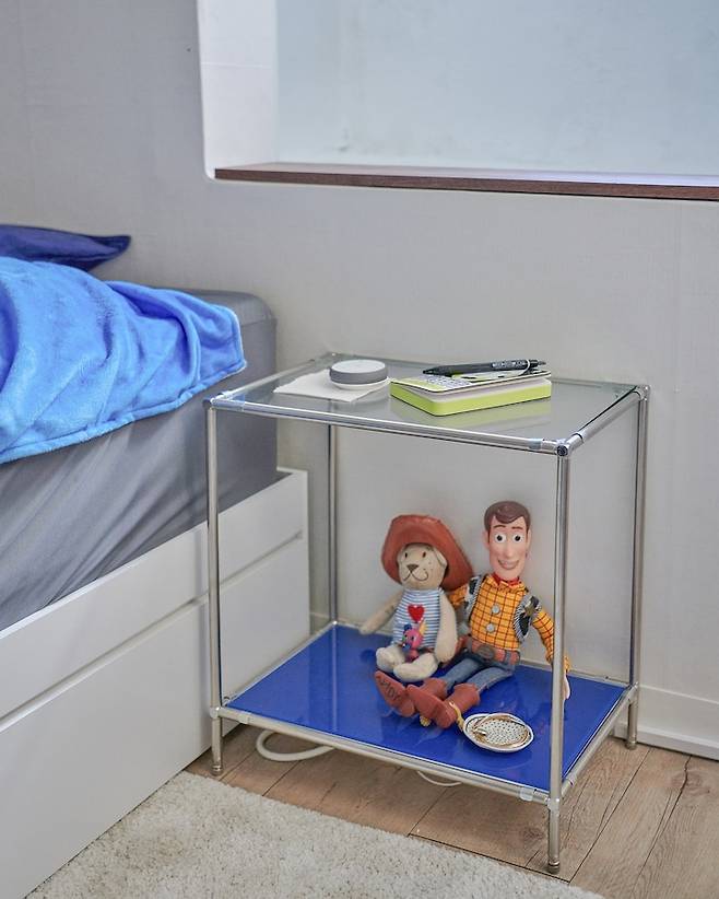 침대의 협탁으로 모듈가구를 놓았어요. 처음엔 판매하는 제품을 찾았는데 원하는 사이즈와 컬러를 찾기 힘들어 냅다 철물사이트에서 부품 사다 만들었습니다. 사이즈를 원하는 대로 맞출 수 있어 굉장히 만족스러워요!! (웬만하면 사세요…)