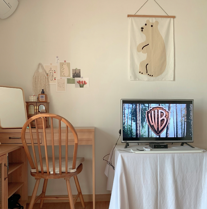 이번에는 화장대 바로 옆에 위치한 TV 공간을 소개해 드릴게요. TV장 같은 경우는 원래 색상이 제 마음에 들지 않아, 현재 흰 천을 하나 구매해 덮어놓고 사용 중입니다. TV 위쪽에는 웜그레이테일에서 구매한 패브릭 포스터를 걸어보았는데, 지금 봐도 너무 귀엽네요!