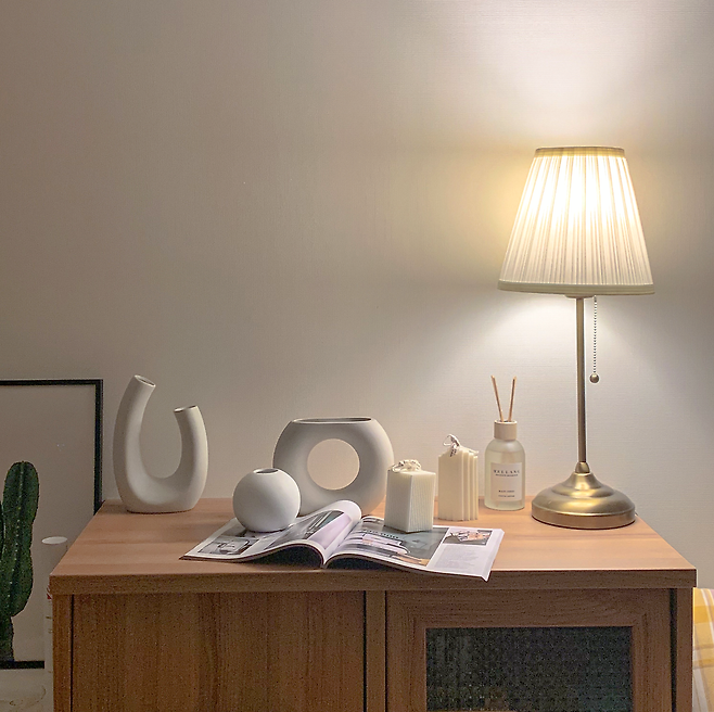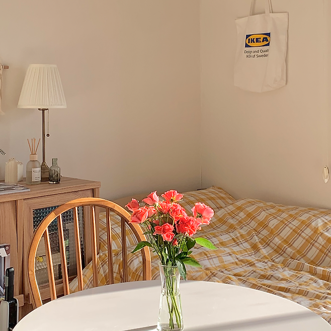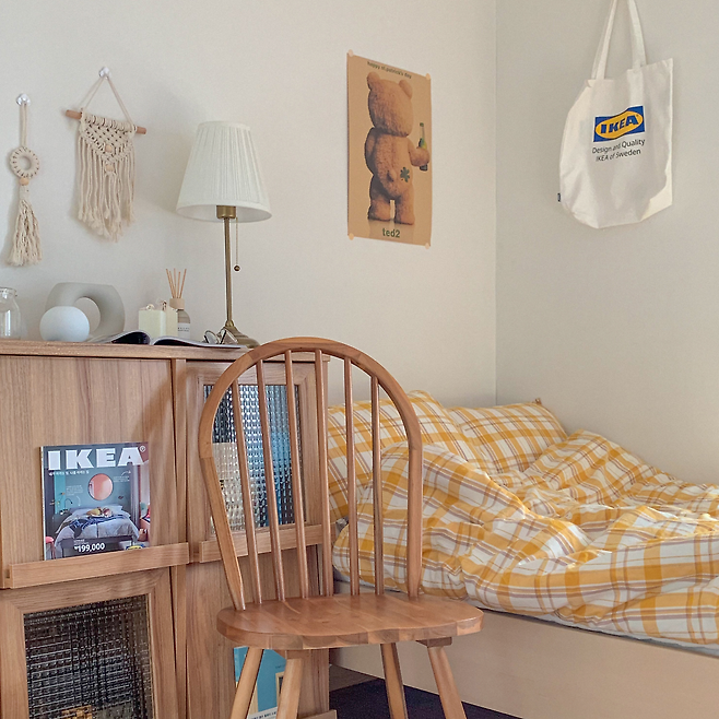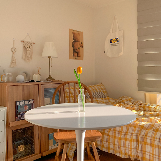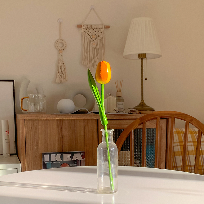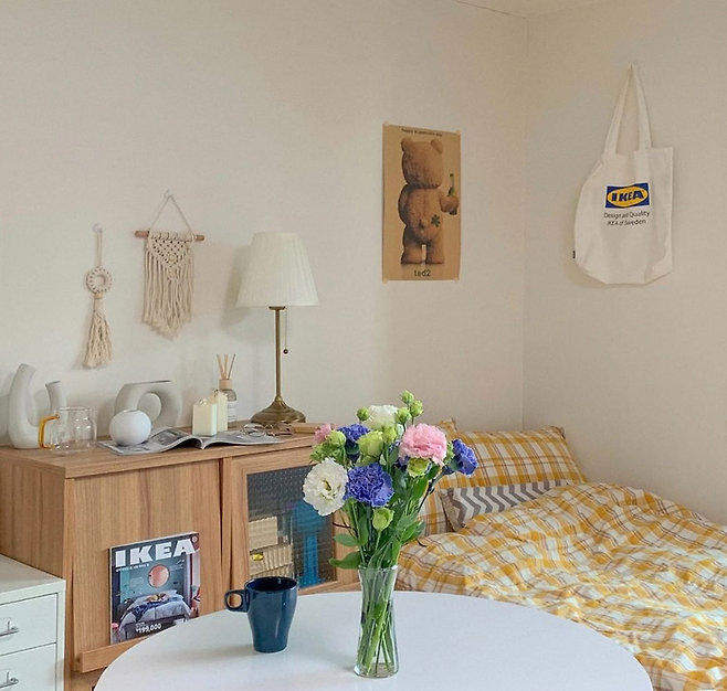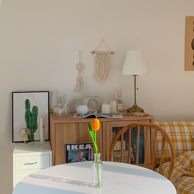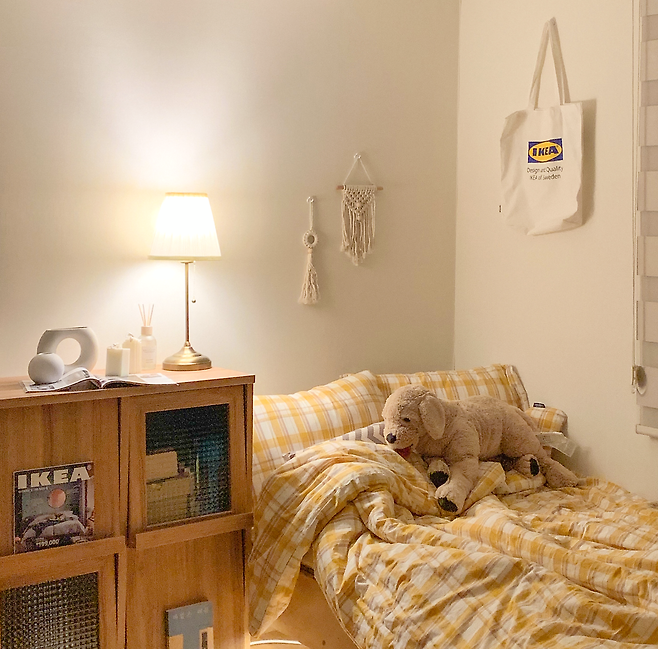 그리고 수납장 위에도 마찬가지로 이케아에서 가져온 잡지와 조명, 그리고 몇 가지 장식품을 놓아두었습니다. 이렇게만 했을 뿐인데, 침실 분위기가 정말 달라지더라고요. 이케아 잡지는 저에게 있어, 인테리어 치트키라고 할 수 있을 것 같아요. 가끔씩 잡지를 보다가 가구를 사고 싶은 충동에 사로잡히긴 하지만요.