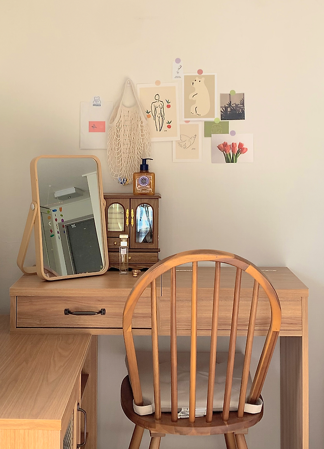 지금은 제가 왜 한 달이나 고민했는지 이해가 되지 않을 정도로 정말 잘 쓰고 있어요. 구조 및 용도에 따라 모양도 바꿀 수 있어서 활용도도 정말 높아요. 저처럼 ㄱ자로 배치해두셔도 되고, 그게 싫다면 그냥 수평방향으로 배치를 할 수도 있어요. 사진상으로는 잘 보이지 않지만, 화장대 오른쪽에 여닫을 수 있는 거울도 같이 배치되어 있기 때문에 굳이 저처럼 거울을 따로 구매하지 않으셔도 된답니다.