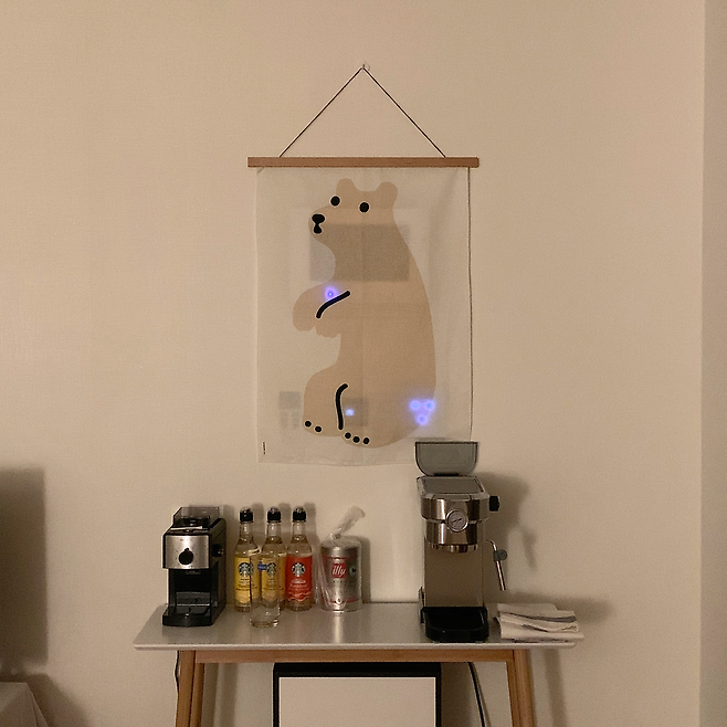이 패브릭 포스터는 제가 아끼는 소품 중 하나인데요. 구매할 때는 가격 때문에 부담스러웠지만, 어디에 걸어도 잘 어울려서 요즘엔 TV 위가 아닌 다른 공간에도 걸어보면서 분위기를 바꿔보고 있어요.