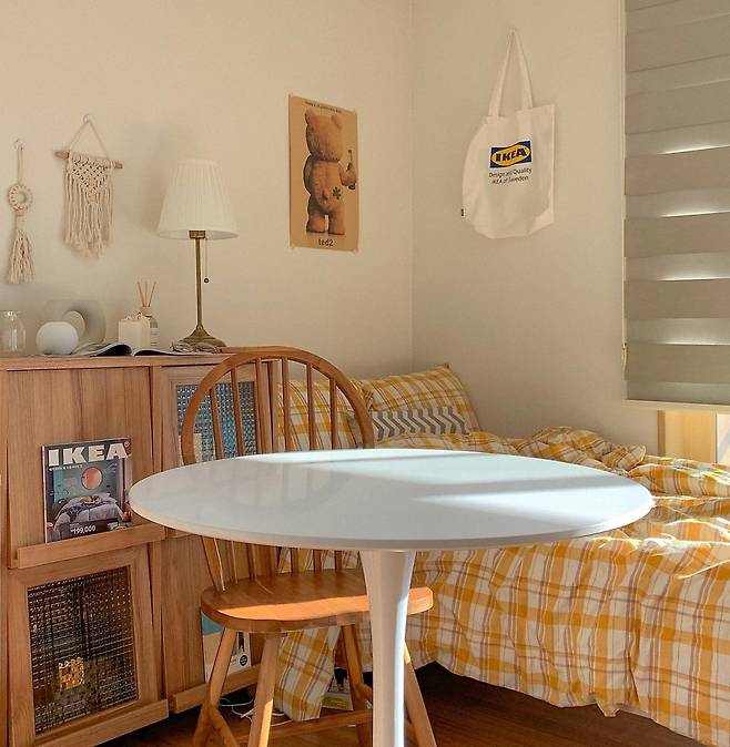 최근 침실에는 테이블이 하나 추가됐어요. 노트북으로 작업할 때나, 커피를 마실 때 쓰기 좋을 만한 테이블이 필요했거든요. 그래서 원목 의자와 화이트 컬러의 원형 테이블을 하나 구매했어요.
