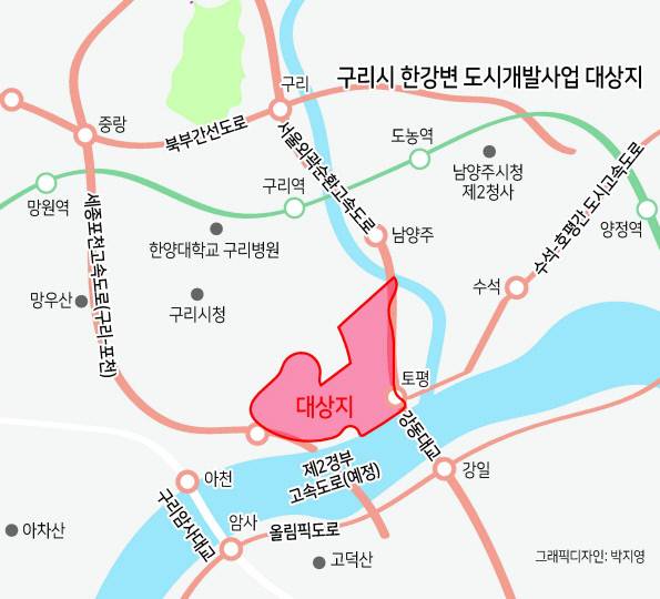 (가칭)구리시 한강변 도시개발사업은 지난해 8월 ‘2035년 구리도시기본계획 수립(안)’ 승인을 위한 경기도 도시계획위원회 심의 이후 지난해 12월 경기도 최종 승인이 나면서 탄력을 받고 있다. 개발제한구역(그린벨트·GB) 해제시 시가화 예정용지가 80만7000㎡(24만평) 반영됐다.