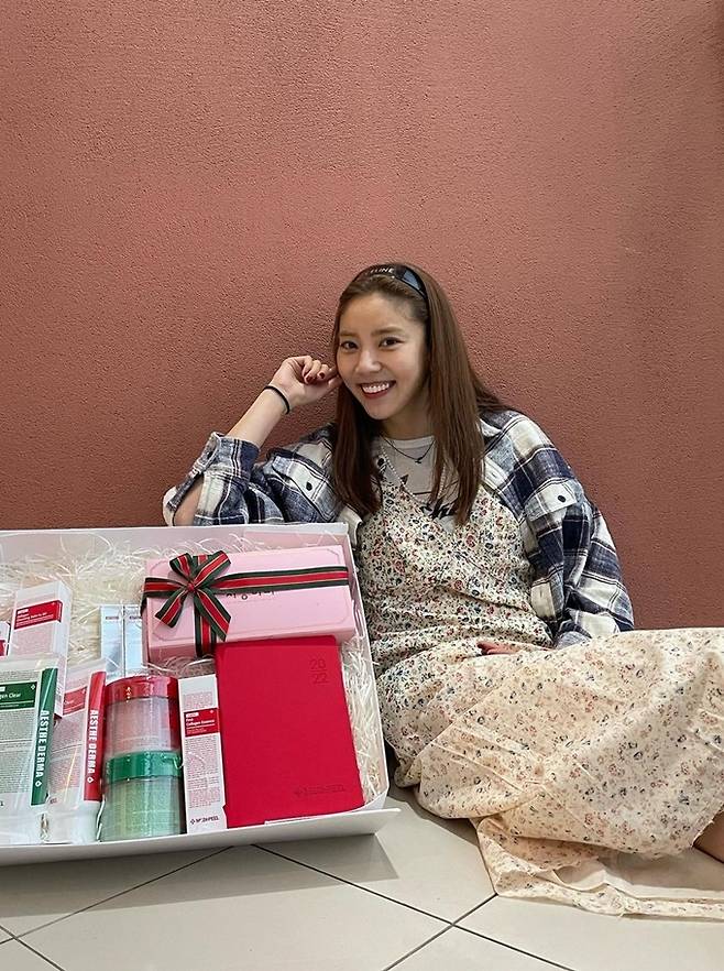 공개한 사진에서 손담비는 선물을 받고 기뻐하는 모습과 함께 화이트 티셔츠에 화사한 뷔스띠에 원피스를 입고 체크 셔츠를 걸친 빈티지 레이어드룩을 완성했다.
