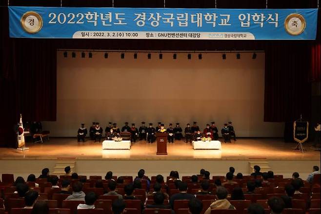 경상국립대학교(GNU·총장 권순기)는 2일 가좌캠퍼스 GNU컨벤션센터 2층 대강당에서 ‘2022학년도 경상국립대학교 입학식’을 개최했다.