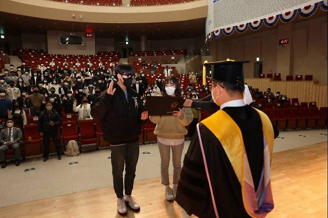 이날 입학식은 코로나19 감염병 확산을 방지하기 위해 학과·전공별 1명, 학부 2명, 주요 보직자와 내빈 등 인원을 150명 이내로 제한해 진행했다.