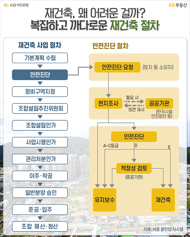 재건축은 기본계획 수립부터 준공까지 절차가 복잡하기 때문에 사업에 소요되는 시간도 상당한 편입니다. 특히 재건축 사업의 암초라 꼽히는 안전진단의 경우, 적정성 검토에서 많은 사업지들이 고배를 마시곤 하죠. 하지만 새 정부가 재건축 규제 완화를 공약으로 내세우면서 전국 곳곳에서 재건축 사업을 시작하려는 움직임이 활발하게 나타나고 있습니다.