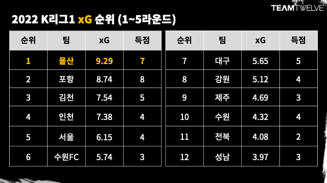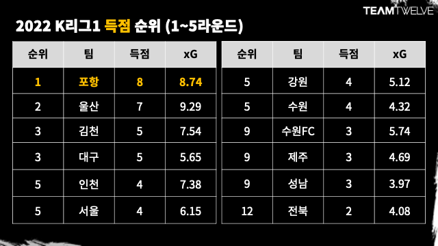 리그 순위와 마찬가지로 득점력이 뛰어난 두 팀은 포항 스틸러스와 울산이다. 포항은 8골로 현재 리그 최다 득점이다. 실 득점과 8.74의 xG 값이 엇비슷한 하다. 득점 기회를 잘 살려서 득점을 하고 있다는 의미다. 울산 xG는 9.29로 리그에서 가장 높다. 울산이 9골 이상 넣었어야 했다고 데이터는 말한다. 다만, 팀은 실제로 이것에 약간 못 미치는 7골을 넣었다. 나쁘지는 않다.
