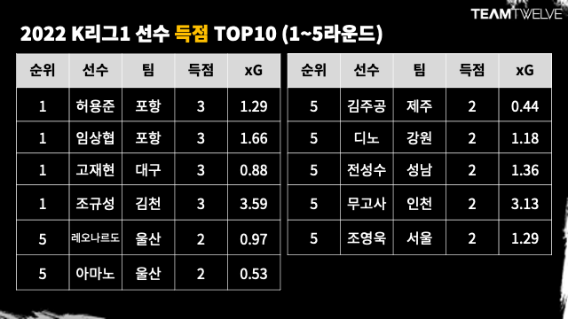 포항의 두 공격수가 나란히 3득점을 해 득점 공동 선두에 올라 있다. 공격수 맛집은 이유가 있다. xG값이 0.88에 그치는 대구 FC 고재현이 3골이나 넣은 것도 눈에 띈다. 놀라운 결정력이다. 국가대표로 활약 중인 조규성도 3골을 넣었다. 득점 선두 중 유일하게 득점수와 xG값이 비슷하다.