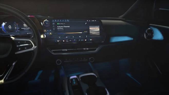 메인 인포테인먼트 화면은 상당히 큰 사이즈로 왼쪽 상단 모서리에 위치한 볼륨 조절장치 등 실버라도 EV와 유사성을 보이고 있으며, 화면 아래에는 실내 온도 조절 장치로 보이는 통풍구와 물리적 작동 방식의 버튼/노브 등을 확인할 수 있다.