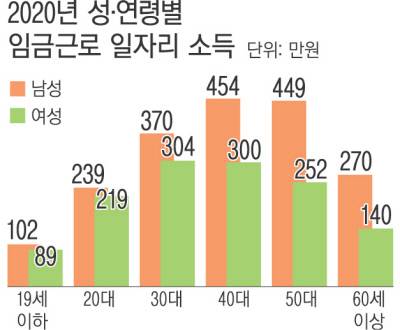 여성 평균임금은 247만원, 남성 평균임금은 371만원으로 남성이 여성의 약 1.5배였다. 20대 남성(239만원)은 여성(219만원)보다 월 20만원 더 벌었다. 30대 성별 격차는 66만원, 40대는 154만원으로 연령대가 높아질수록 남녀 격차가 벌어졌다. 30대 이후 여성들의 경력단절이 확대되는 데다 저임금 업종·중소기업 취업 비중이 크기 때문이다. 같은 대기업에서도 남성의 월평균 소득은 599만원, 여성은 370만원으로 임금 격차가 컸다.