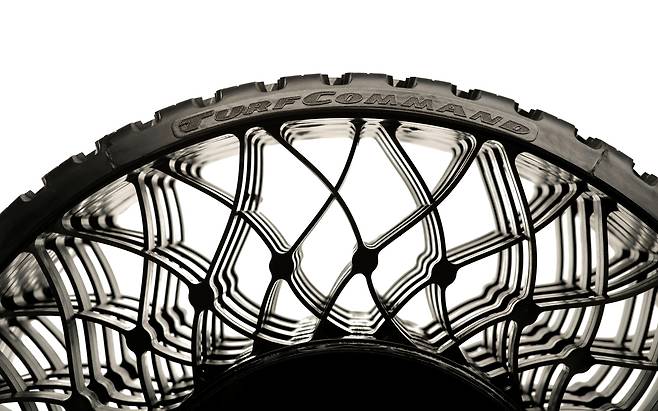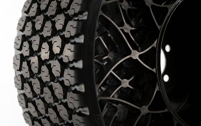 두 번째 장점은 내구성. 타이어의 수명은 트레드와 사이드 월을 이루는 고무보다 수명이 짧다. 따라서 타이어가 마모 한계선 이상으로 마모하면, 하중 지탱과 충격 흡수를 담당하는 ‘카카스(Carcass)’ 부분이 외부로 드러나 공기가 빠져나갈 위험이 높다. 타이어 수명을 3만㎞로 잡는 이유다. 반면 에어리스 타이어는 트레드 부분의 고무가 닳아도 쓸 수 있다. 그 결과 일반 타이어보다 약 3배 더 긴 수명을 가진다.