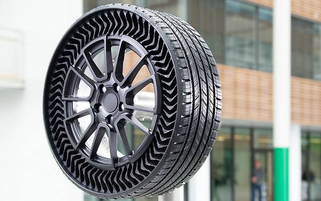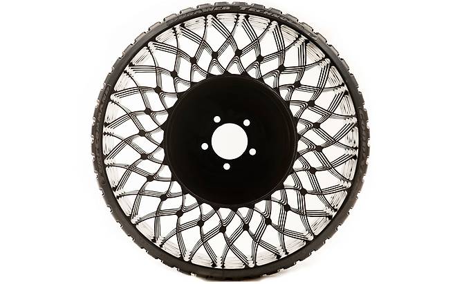 다른 제조사는 어떨까? 브리지스톤은 2011년 펑크 방지용 에어리스 타이어를 선보였다. 한국타이어는 2013년 자체 개발한 에어리스 타이어 콘셉트를 공개했다. 미쉐린은 2019년 에어리스 타이어 ‘업티스(UPTIS)’를 발표했다. 미쉐린은 “2024년까지 제너럴 모터스(General Motors, 이하 GM)에 에어리스 타이어를 공급할 예정”이라고 밝혔다.