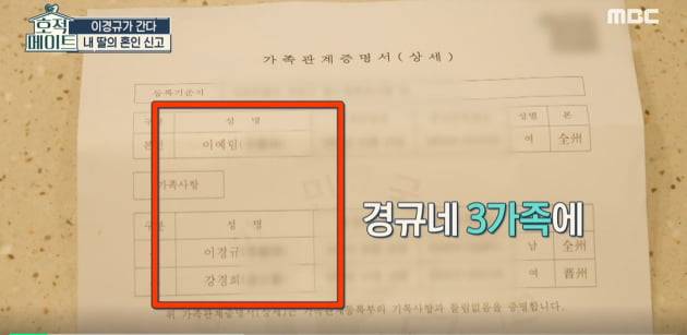 가족관계증명서에는 아버지 이경규와 어머니 강경희만 있었지만, 혼인신고를 하면 김영찬이 올라오게 된다.