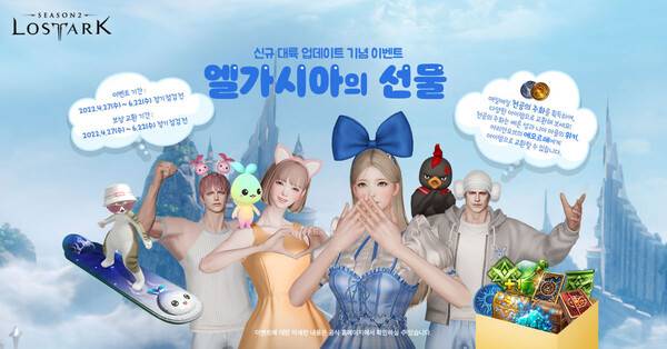 스마일게이트 RPG는 '엘가시아의 선물' 이벤트도 진행한다. 6월22일까지 매일 게임에 접속해 카오스 던전 혹은 가디언 토벌을 클리어하고 '천공의 주화'를 획득할 수 있으며, 획득한 천공의 주화를 사용해 '모코코 펫'과 '모코코 보드', '동물 아바타' 등 특별한 아이템으로 교환할 수 있다.