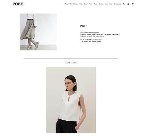 무심한 듯 시크한 프렌치 감성의 콘셉트가 돋보이는 포이. 어떻게 입어도 쿨하고 멋스러운, 루스한 실루엣의 제품들이 눈길을 끈다. 모델의 키는 169㎝로 스타일이 굉장히 좋아 구매하지 않더라도 보는 재미가 가득하다. 타 쇼핑몰에서 볼 수 없었던 트렌디하고 유니크한 액세서리도 많아 함께 구매하기 적합하다.