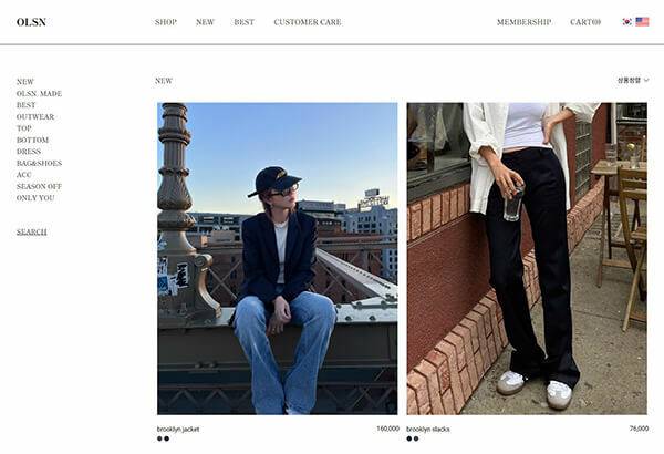 올슨은 빈티지하면서도 캐주얼한 분위기의 키 큰 여성 쇼핑몰이다. 요즘 유행하는 트렌드에 맞는 꾸안꾸 룩을 선보이고 있다. 레더 재킷에 미니스커트를 매치하거나, 브라톱에 재킷을 걸치는 등 자유로운 스타일링으로 여성들의 구매 욕구를 자극하고 있다. 편안하면서도 스타일리시한 룩을 원한다면 올슨을 추천한다.