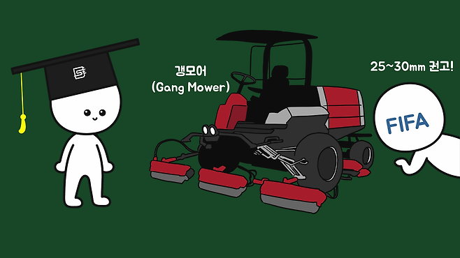 잔디를 깎을 때는 갱모어(Gang Mower)라는 기계를 이용하는데, 국제축구연맹에서 권고하는 잔디의 길이는 25~30mm입니다. 왜냐하면, 잔디 길이가 너무 길면 마찰이 늘어 공이 느리게 굴러가고, 공의 탄성이 줄어들기 때문입니다.