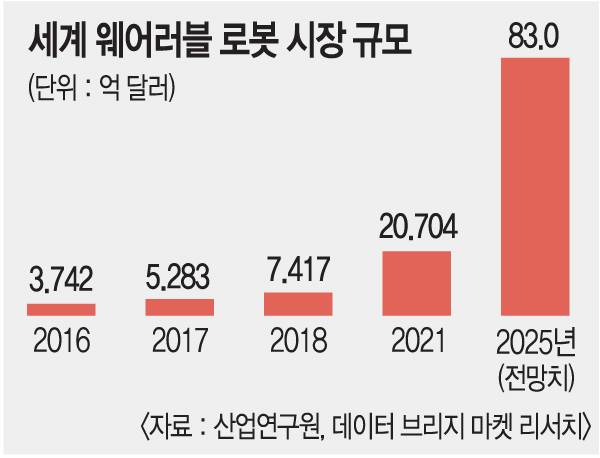 방산 기업들이 웨어러블 로봇에 주목하는 배경에는 ‘무인화 흐름’이 자리한다. 6일 시장조사기관 데이터브리지 마켓 리서치와 산업연구원에 따르면 글로벌 웨어러블 로봇 시장은 2017년 5억2800만 달러(6252억원)에서 2025년 83억 달러(9조8000억원)까지 팽창할 것으로 추산된다. 연간 평균 성장률은 약 40%에 달한다.
