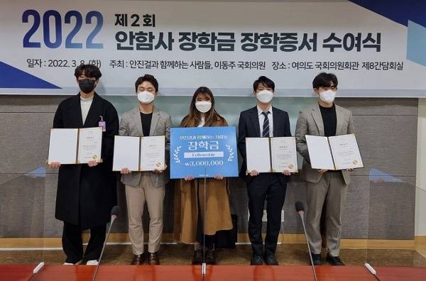전날 8일 오후 5시 서울 여의도 국회의원회관 8간담회장에서 열린 안함사장학금(2회) 수여식에는 대상자인 꿈수저 청년 6명이 참석해 1인당 300만 원 받았다. 안함사 장학금은 지난 1월에도 5명의 꿈수저 청년들에게 1인당 300만 원씩을 수여한 바 있다.