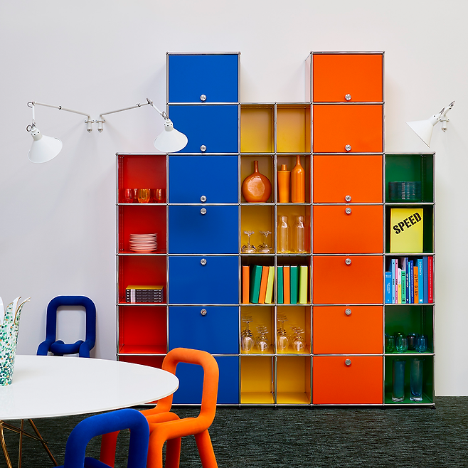 USM 할러는 우리가 그동안 익숙하게 여기던 일체형 가구와는 확연히 다른 형태다. 부품을 내 마음대로 조립해서 사용하는 '모듈 가구'인 것. 구조는 단순하고 명료하다. 스틸 튜브와 볼, 패널이 구성품의 전부다. 이를 활용해 본인의 취향에 맞게 조립만 하면 된다니, 이보다 심플한 이치는 없다. 다만 놀라운 사실은 점과 직선, 면의 조합만으로 선반부터 수납장, 책상, 파티션까지 다양한 가구가 완성된다는 것이다. 14개의 컬러로 구성된 USM 할러 시스템을 토대로 조명과 USB 충전 옵션이 더해진 할러 E를 비롯해 화분과 책상, 데스크용 액세서리 등 다양한 아이템을 추가할 수 있다. 말 그대로 무한한 확장이 가능한 '가구계의 레고'인 셈이다. 개인의 취향이 점점 중요해지는 오늘날의 라이프스타일과 안성 맞춤이다.
