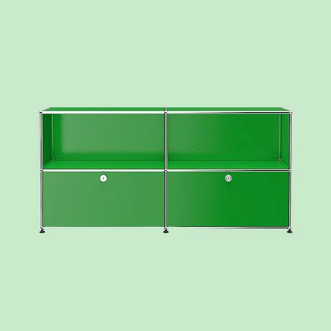 상단은 노출형 선반으로 하단은 수납형 서랍으로 사용할 수 있다. 아래로 열리는 드롭 다운 도어 방식을 선택해 편하게 여닫기 좋다. 비비드한 그린 외에도 다양한 컬러가 구성되어 있어 취향에 맞게 변경 가능하다.