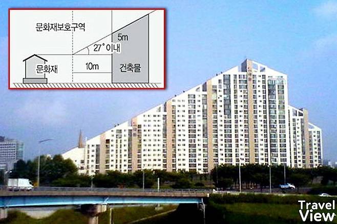 양각 규제는 역사 문화재의 경관을 보호하고 위해 도입되었습니다. 제한은 문화재로부터 거리가 멀수록 약해지는데요. 시티 극동 아파트는 1997년 해당 규정에 맞춰 아파트를 지었고 최대한 세대수를 확보하기 위해 사선 모양으로 만들어진 것입니다.