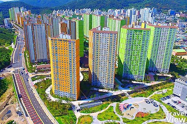 이러한 풍경으로 인해 반지의 제왕의 헬름 협곡을 떠오르게 한다고 '부산의 헬름 협곡'이라는 별칭이 붙여지기도 했습니다. 한편 부산에는 승학산, 백양산, 황령산, 달음산 등 수많은 산이 있어 이와 같은 형태의 아파트가 많은 것으로 알려졌습니다.