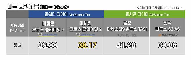 윈터 타이어는 18m 대 기록을 냈다. 다음은 CC2인데 약 21.9m 수준으로 다른 4계절 제품보다 확실히 좋았다. 다음은 CC+였는데 23.8m 수준이라 CC2 보다 거리 격차가 컸다.
