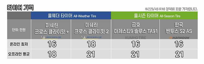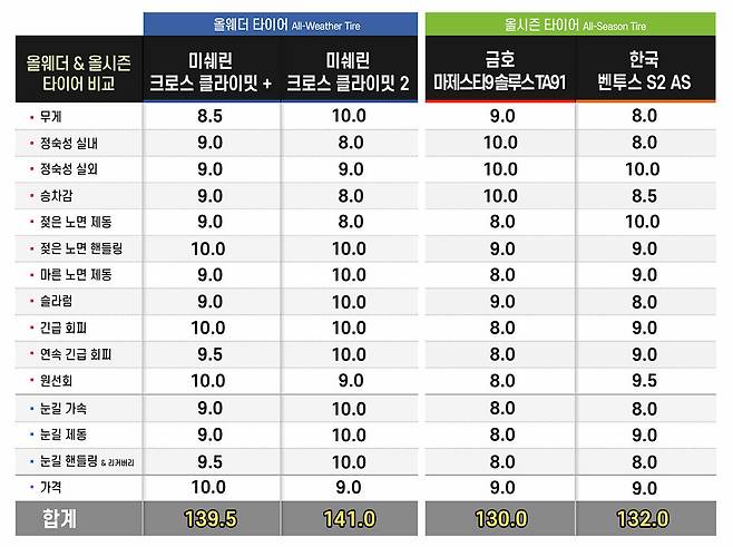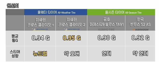 이번에 다룰 타이어 그룹은 올웨더, 올시즌 간의 대결이다. 각각의 타이어 성격이 다르기 때문에 직접 비교하기엔 부담이 따른다. 그러나 두 타이어의 성능 차이가 궁금했다. 그래서 장르를 나누되 같은 기준으로 평가해 봤다.