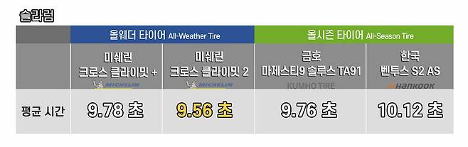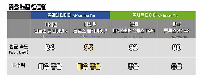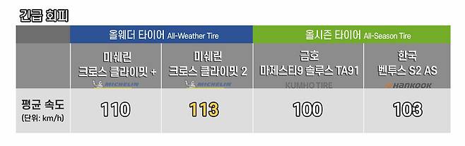 여기서도 CC2가 유일하게 평균 시속 90km 내외를 유지했다. 압도적인 성능 차이였다. 다음은 CC+였는데 평균 시속 85km 정도 수준으로 CC2에 밀렸다. 금호와 한국 올시즌 타이어의 성능도 그대로 유지돼 S2AS가 앞서는 모습을 보였다.