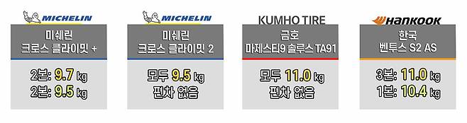 이 부분에서는 미쉐린 CC2가 가장 높은 점수를 받았는데, 다른 타이어 보다 가벼웠기 때문이다. 타이어를 가볍게 하기 위해 좋은 소재가 들어가야 할 때도 있다. 타이어를 절개하지는 않았지만 타이어의 경량화 이점, 품질 편차가 적다는데 점수를 줬다. 물론 무게에 변수가 될 부분이 있긴 하다. 트레드 깊이 차이인데, 올웨더 대비 올시즌 제품들의 트레드 홈이 평균 1~1.5mm 깊었다. 그러나 이것으로 타이어 수명을 예상하기는 어렵다. 마제스티9도 (무게) 품질이 좋았지만 올웨더 제품 대비 다소 무거웠다. S2AS는 무게도 품질도 뛰어나지 못해 아쉬움을 줬다.
