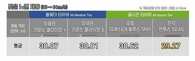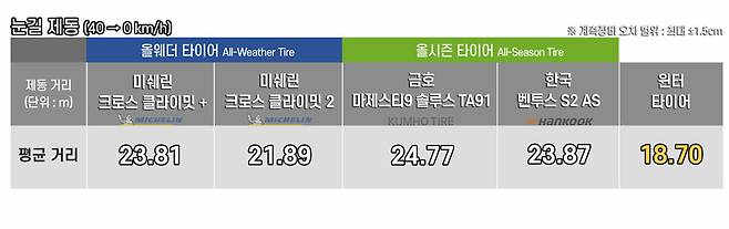 윈터 타이어는 18m 대 기록을 냈다. 다음은 CC2인데 약 21.9m 수준으로 다른 4계절 제품보다 확실히 좋았다. 다음은 CC+였는데 23.8m 수준이라 CC2 보다 거리 격차가 컸다.